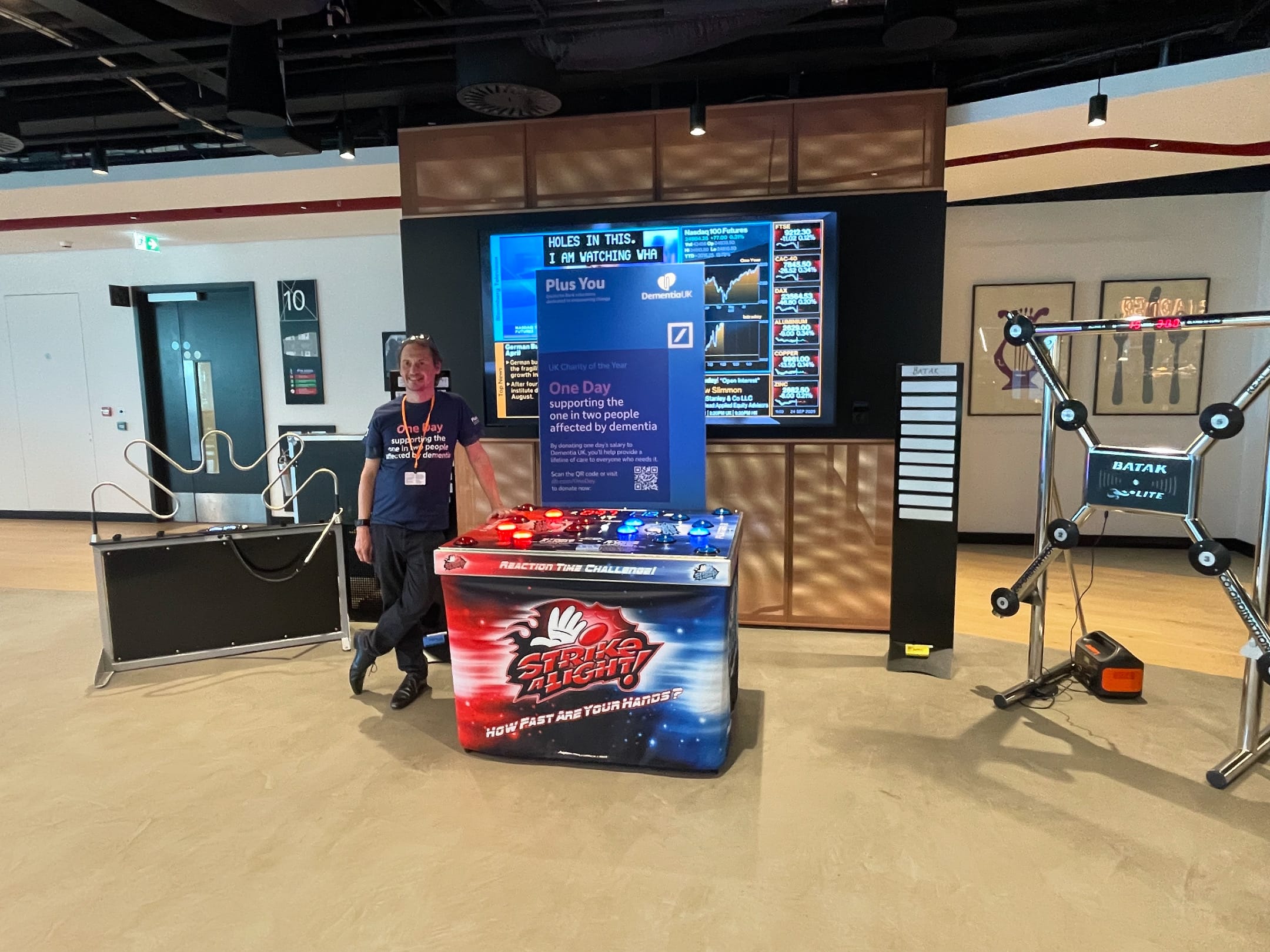 Deutsche Bank in Central London hosted a fundraising and awareness day in support of Dementia UK, with interactive games supplied by Fun & Games Event Hire. Employees were encouraged to donate one day’s salary to the charity while enjoying challenges including Batak, Buzz Wire and Strike a Light.