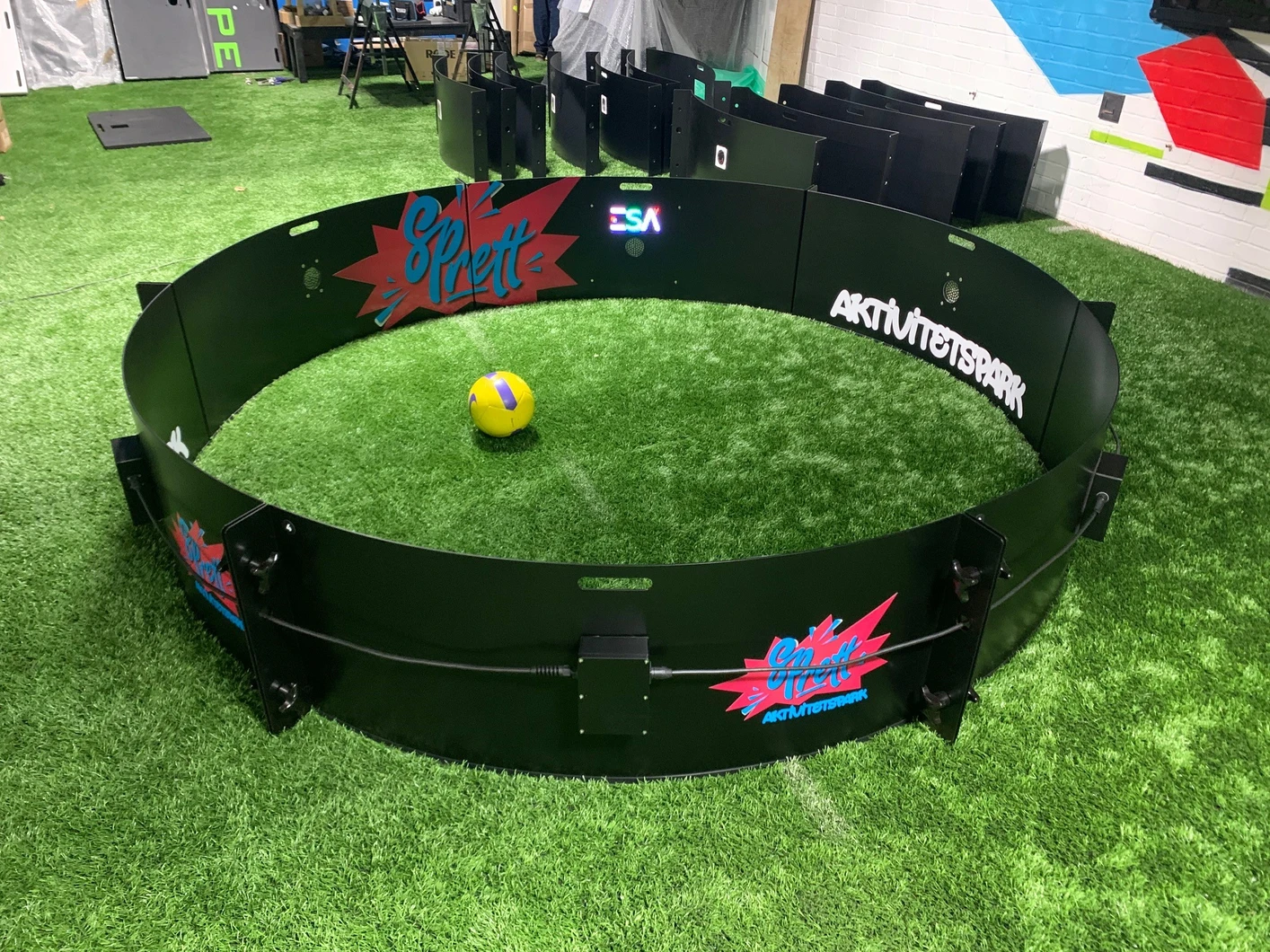 The aim of the game is to pass the ball against the internal walls of the arena, following a random patterns of LED target lights, with the sensors in each panel instantly feeding back to the on board computer and digital scoreboard. Players follow a traffic light system, with each coloured LED target giving different scores (Green = 3 pts, Amber = 1 pt, Red = -1 pt).
