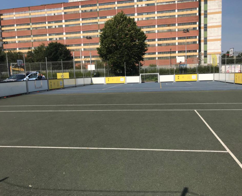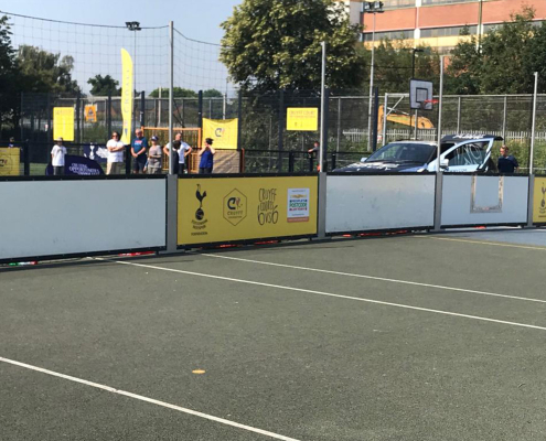 The pitch is constructed from modular panels connected to metal stanchion posts, with surround netting installed above the boards to create a fully enclosed playing arena. Due to the weight and amount of panels involved in the construction of the pitch, we require direct access with our vehicle into the set up site.