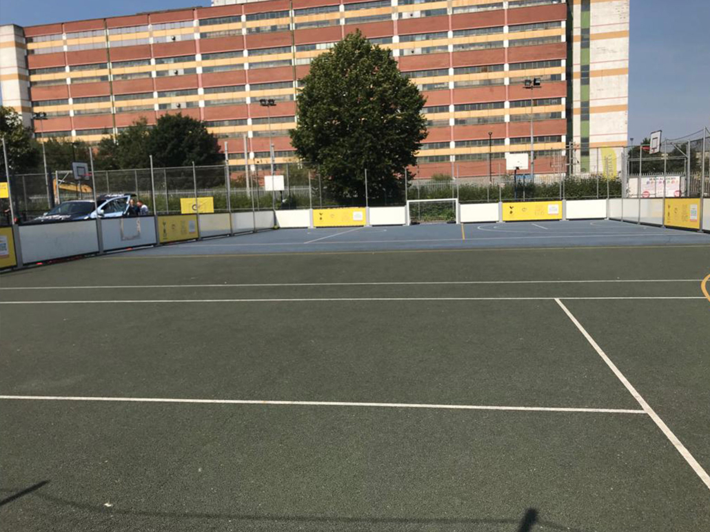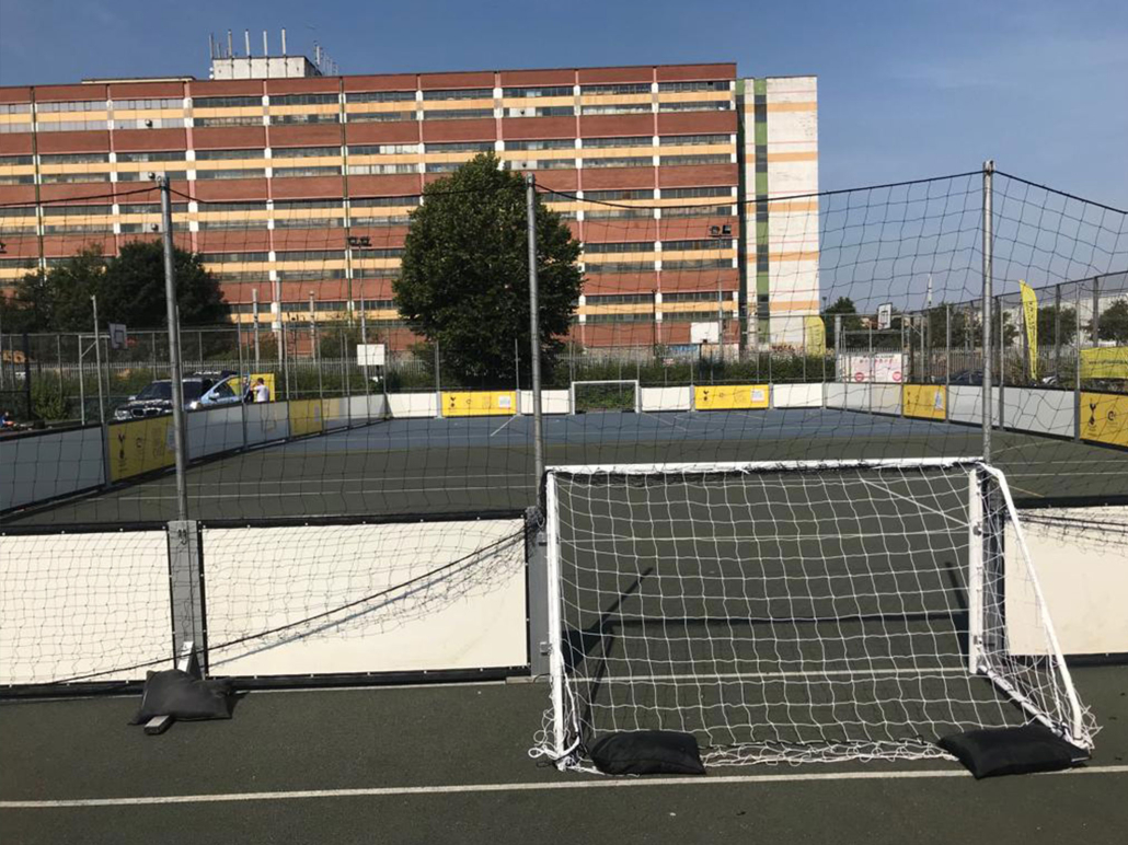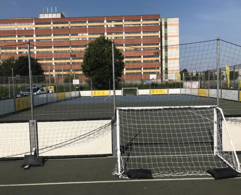 - Large modular football court measuring 15m × 10m with 3m surround netting